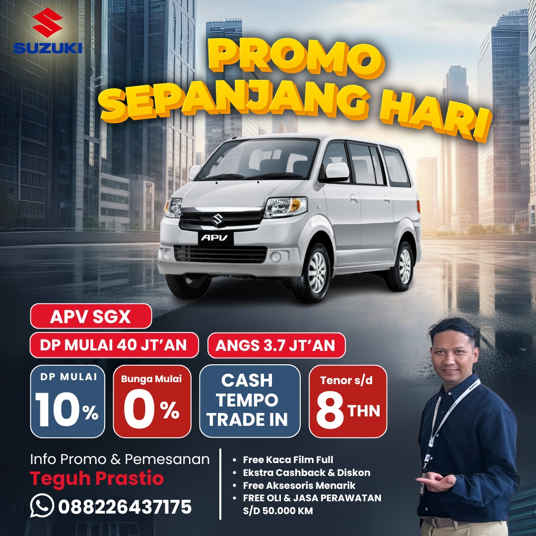 Berkendara dengan mobil berkelas dunia. Promo Suzuki New APV hadir dengan DP murah dan cicilan rendah.
